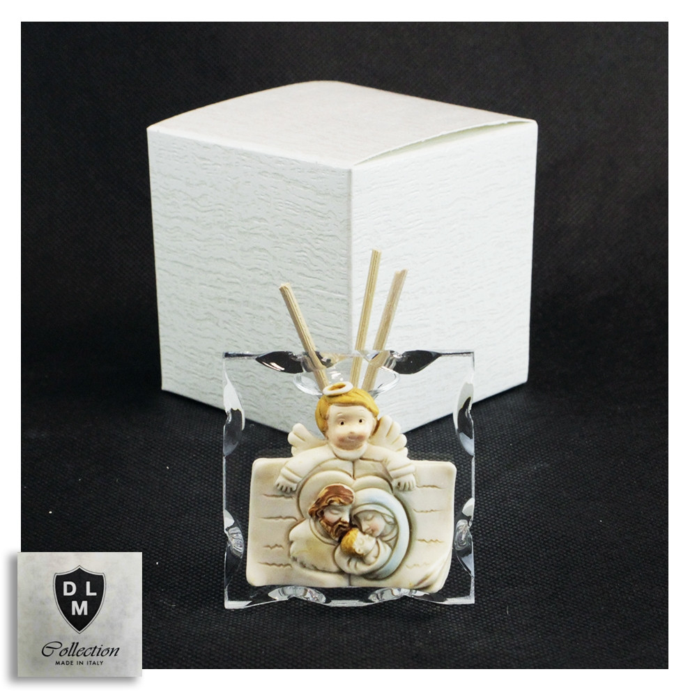 l profumatore è arricchito da un'icona che raffigura la Sacra Famiglia (Giuseppe e la Madonna con il suo bambino tra le braccia), ideali per nascita, compleanno, battesimo, comunione, cresima, laurea, matrimonio, anniversario etc..