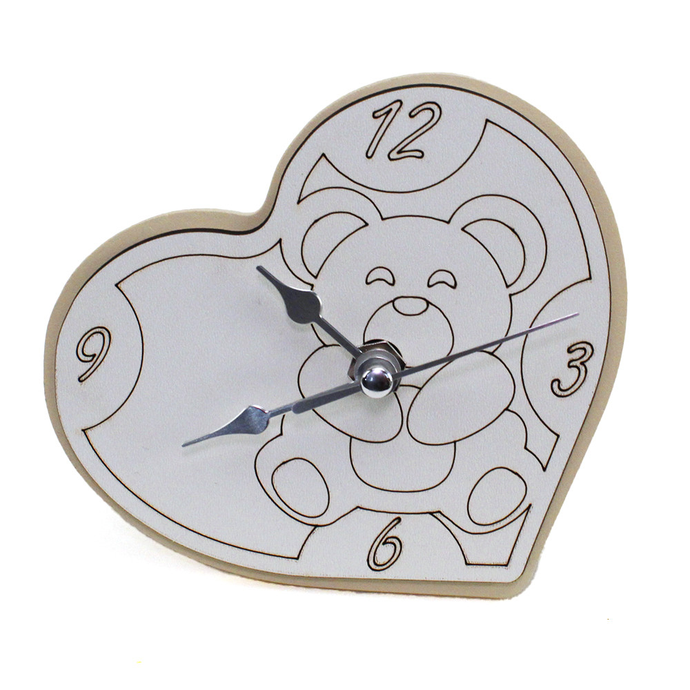 Bomboniere moderne con base in legno e orologio a forma di Cuore con lancette eleganti in metallo. Al centro del cuore è intagliato un Orsetto con Cuori Cuoricini originale idea per confettate e bomboniere, in vendita online a prezzo promozionale!