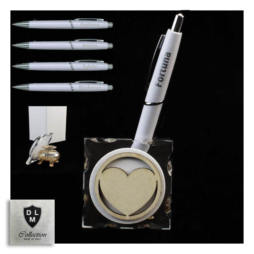 Inclusa n.ro 1 Penna a scatto con dettagli di colore argento assortite in quattro varianti che riportano i migliori auguri di buona Fortuna, Salute, Amore, Ricchezza.